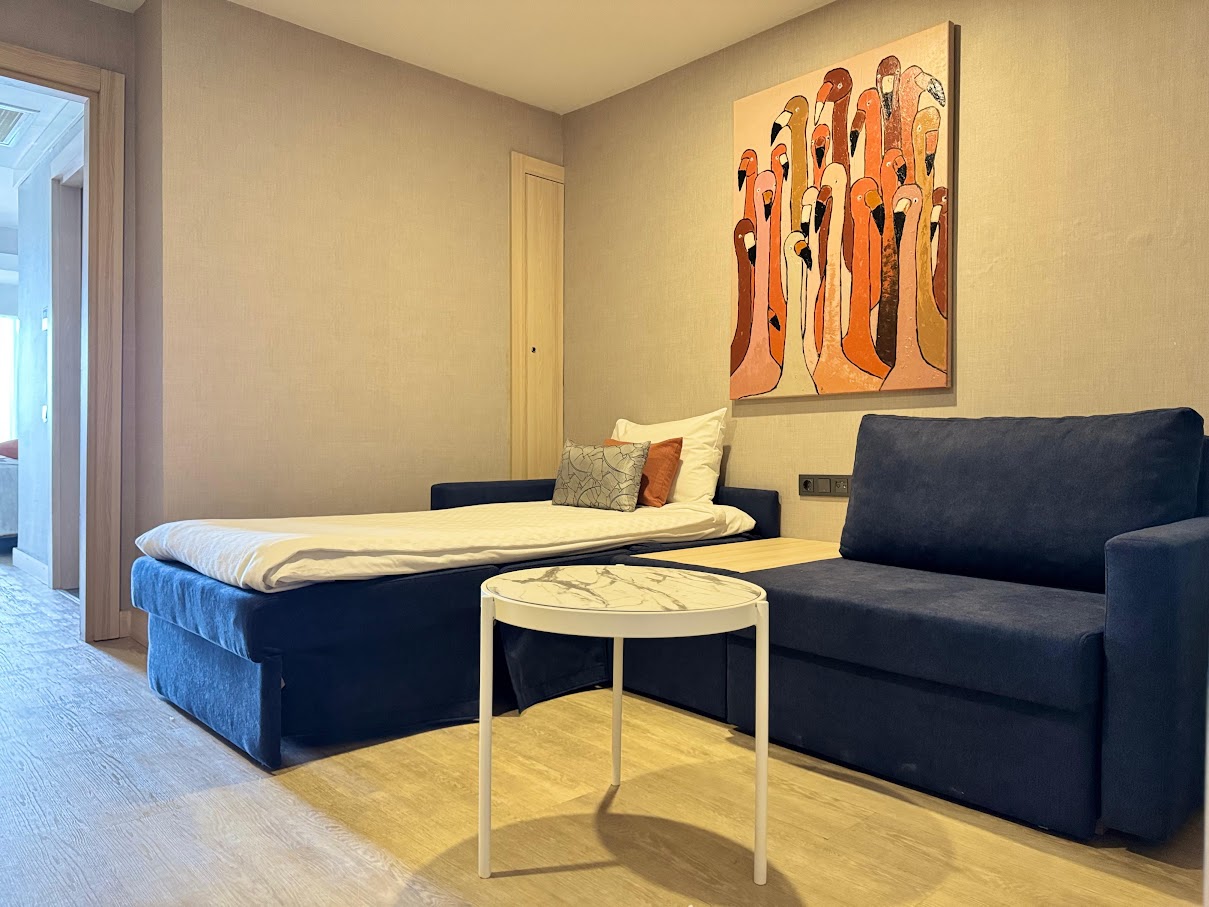 Вид из номера: на море/частичный вид на море Покрытие пола: Ламинат Комнаты в номере: 2 спальни Кровати: 1 двуспальная, 2 односпальные Дополнительное спальное место (одно из): Раскладная кровать, Софа Наполнение мини-бара: Прохладительные напитки, пиво, вода. Обновляется ежедневно. Банные принадлежности: Мыло, Шампунь, Гель для душа Уборка в номере: ежедневно Смена белья: три раза в неделю Комментарии: 1 ванная комната. |